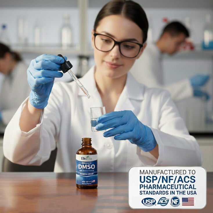 Elko Bio DMSO is USP/NF/ACS pharmaceutical-grade with 99.9% purity—the highest standard of quality available. It is manufactured in the United States under strict quality control protocols and undergoes rigorous testing to ensure it meets or exceeds the standards established by the United States Pharmacopeia (USP), National Formulary (NF), and the American Chemical Society (ACS).